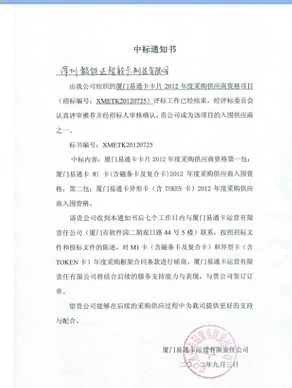 2012年9月3日,在厦门易通卡卡片2012年度采购供应商资格项目中,经评标委员会的综合评定,毅能达成为该项目的入围供应商一。
