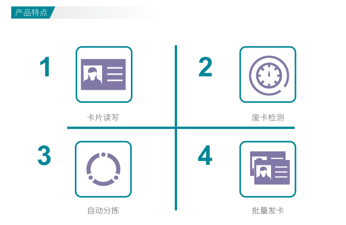 ◆卡片读写 ◆自动分拣 ◆废卡检测 ◆批量制证 ◆前端制证 ◆高速制证